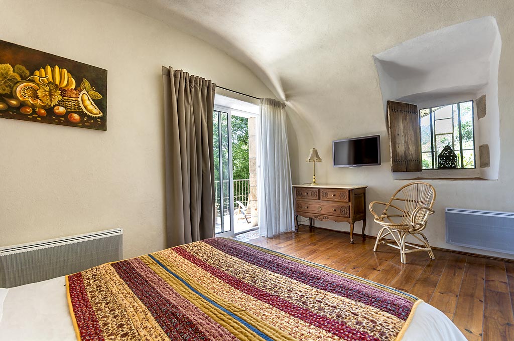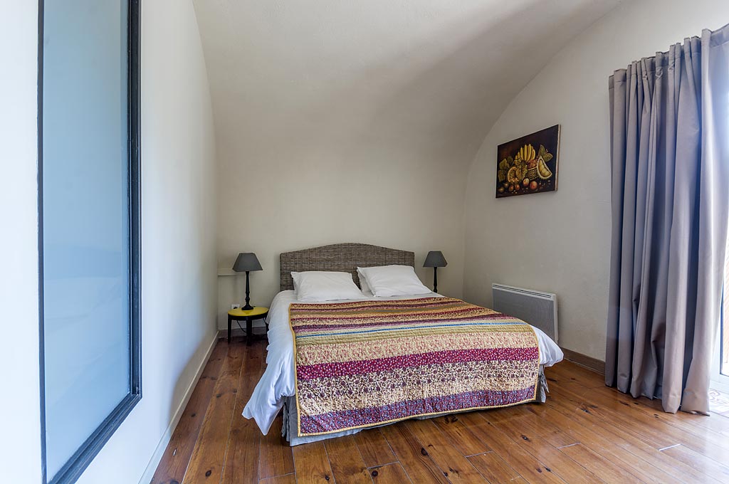 A corridor connects the 2 non-communicating bedrooms: a sleeping area for a young child lit by an opaque glass transom, furnished with a 90cm bed, the master bedroom with a 160cm bed and flat screen TV opening onto a private terrace with a lovely view and allowing access to the garden via a stone staircase.